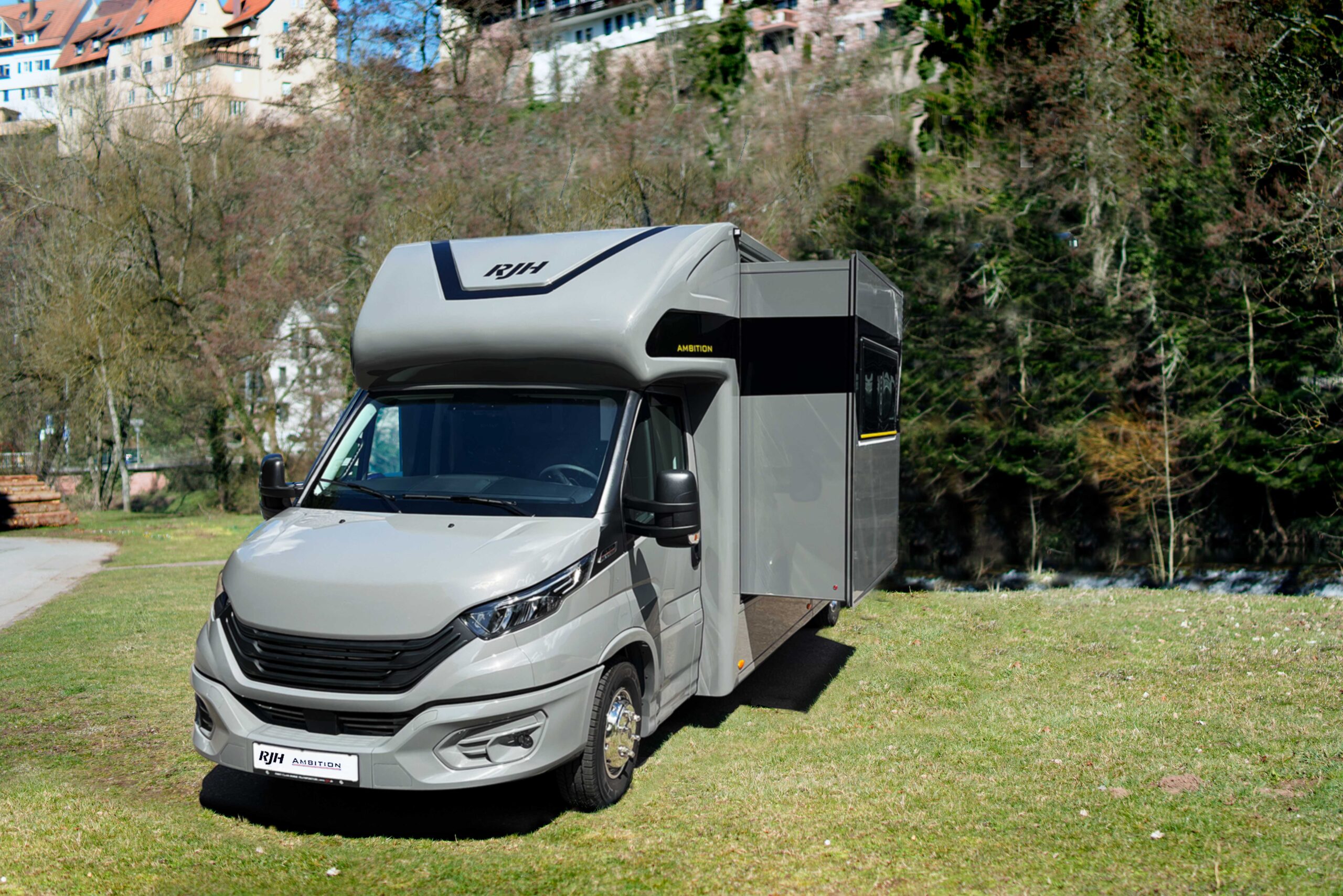 Der Ambition mit Slide-Out und Heckgarage von RJH ist eine absolute Neuheit im Bereich des mobilen Wohnens mit max. 7,2t und 1,5t Zuladung – fahrbar für alle mit dem „alten 3er Führerschein!“.